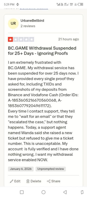 Username : Royal2809 User id:71653609 Registered Email: [email protected] Issue Type: Deposit credited 0 INR but amount deducted Order ID: F-1855643118549083079 Transaction ID (Txid): P_260...7nEAE Order Amount: 5000 INR Credited Amount: 0 INR Status: Processing (from long time) Date & Time: 29/01/2026 at 03:03:02 PM Problem Description: I made a deposit of 5000 INR on BC.Game. The order status is still showing “Processing”, but the credited amount is 0 INR. The amount has been deducted successfully from my side, however it has not been credited to my BC.Game wallet. This is causing financial loss and inconvenience to me. What I Want: I request BC.Game team to either: 1) Credit the full amount of 5000 INR to my account, OR 2) Refund the deducted amount immediately. Proof: I have attached screenshots of the transaction details, order status, and payment confirmation.