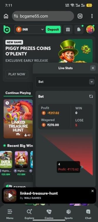 Hi, I am a VIP 25 Gold player (ID: 61357425). I encountered a technical glitch in the game 'Linked Treasure Hunt' by Wali Games. I transferred ₹4,524.21 to the game, but I only wagered ₹270 (as shown in my Live Stats). The remaining ₹4,254.21 disappeared and was never returned to my wallet. I have attached the proof showing that my total wagered amount is only ₹270. Please investigate this and refund my missing balance. User ID: 61357425 Transaction ID: 1860309022460048906