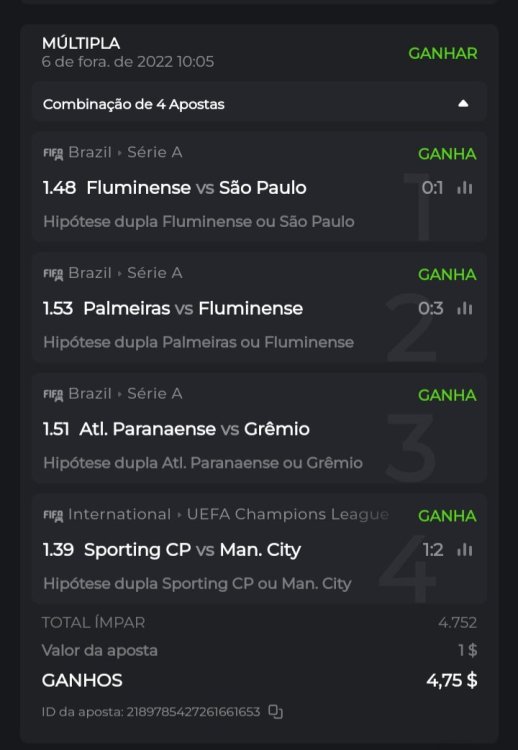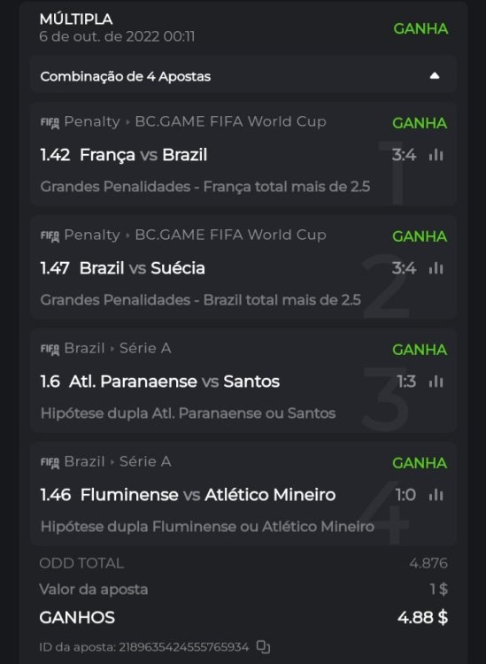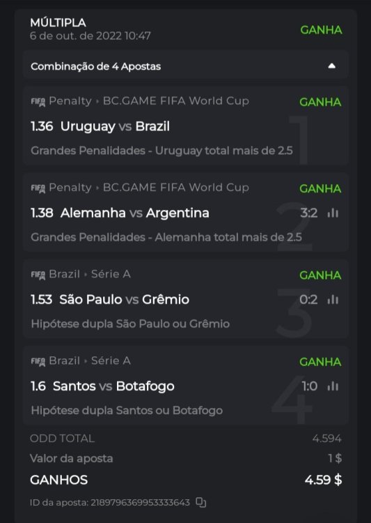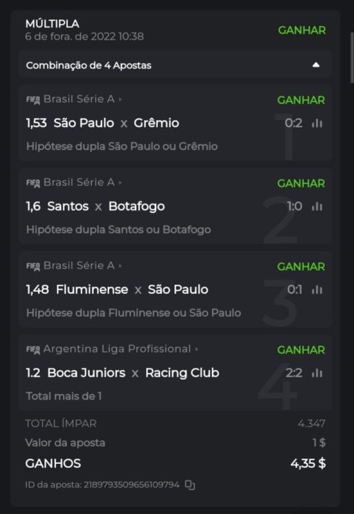 ID da aposta: 2189635424555765934 ID da aposta: 2189796369953333643 ID da aposta: 2189793509656109794 ID da aposta: 2189785427261661653